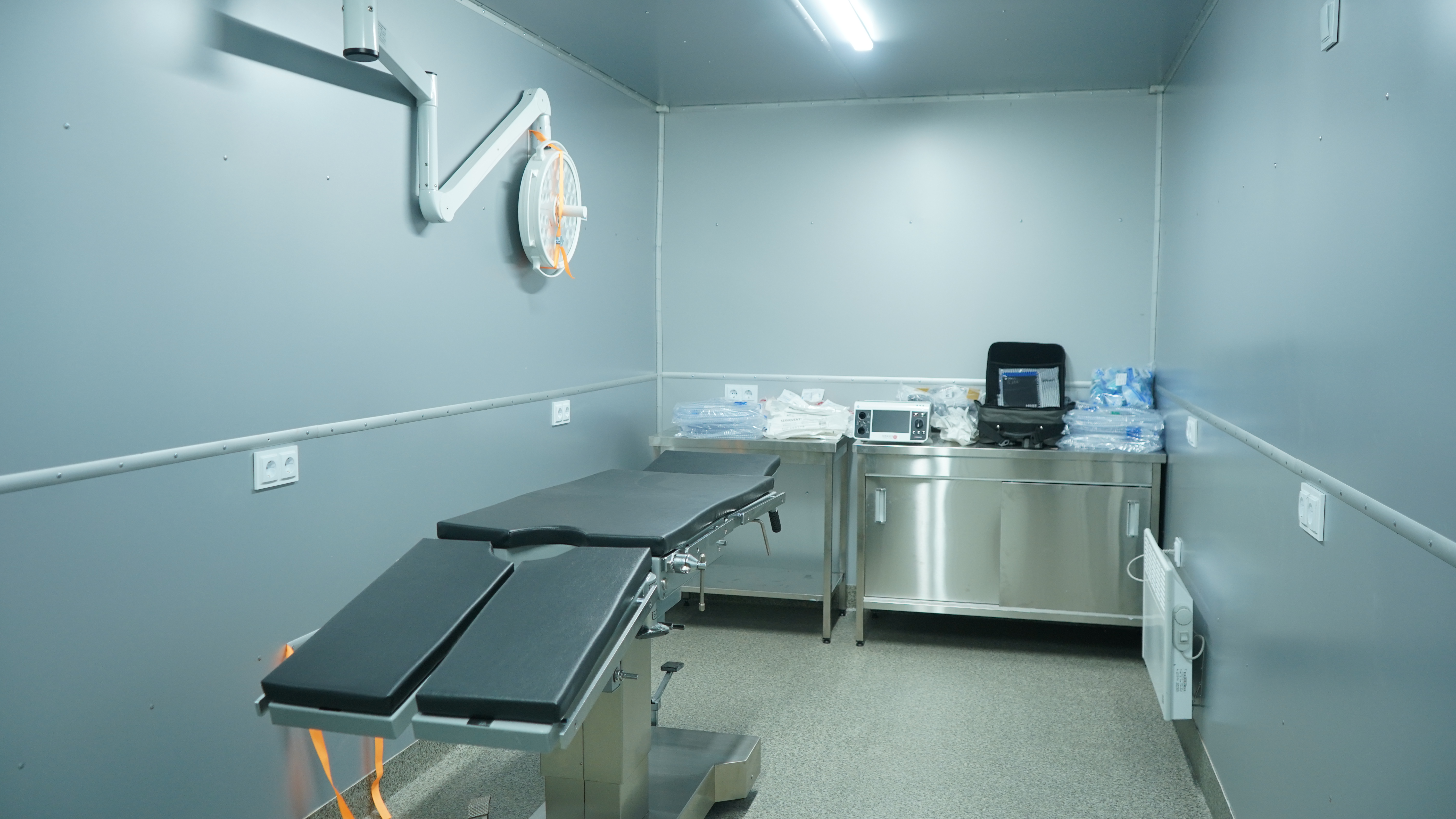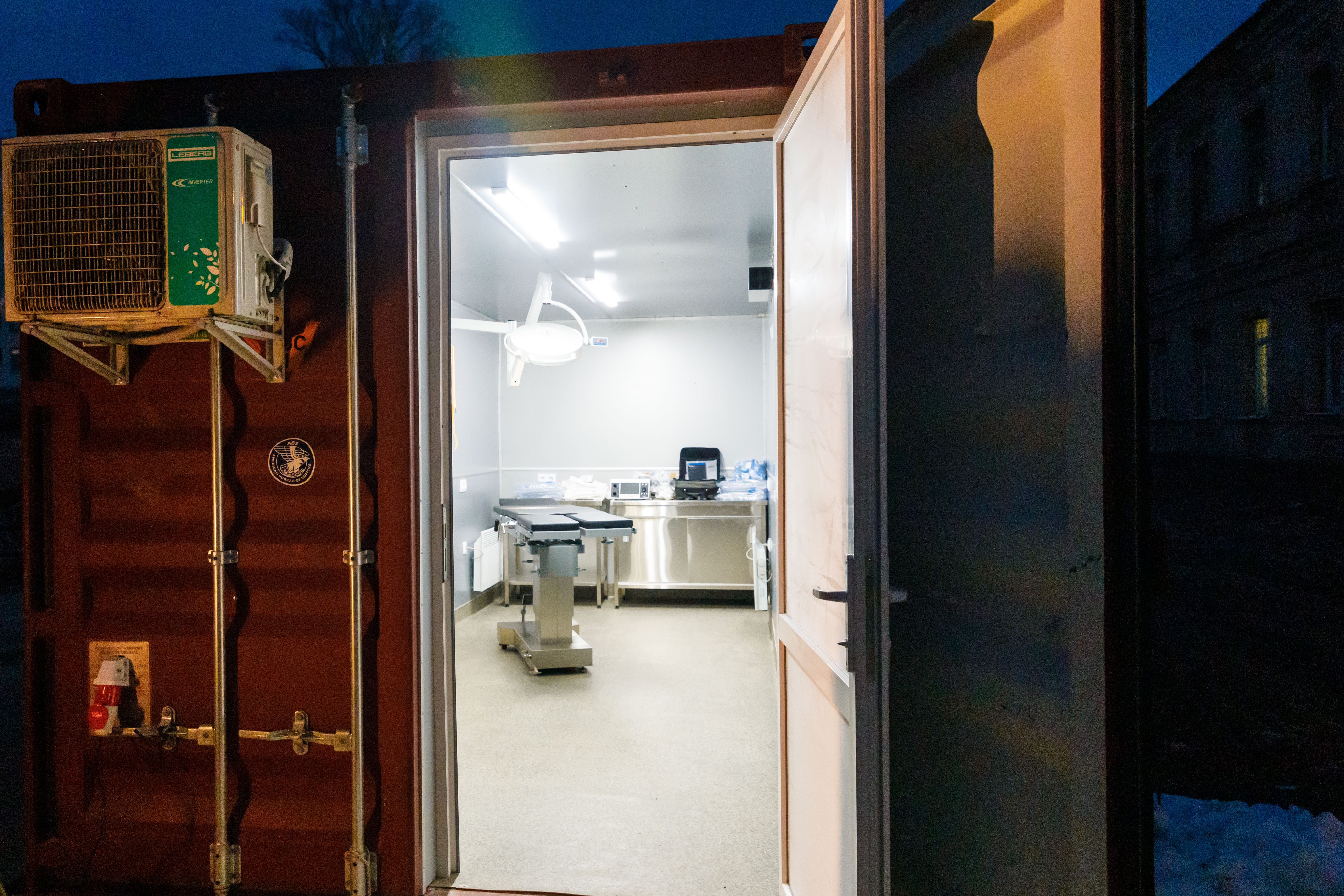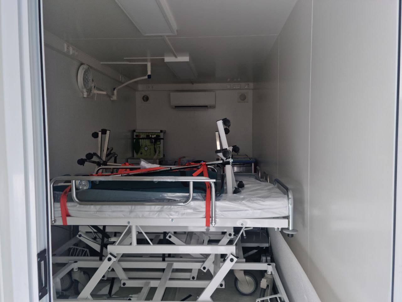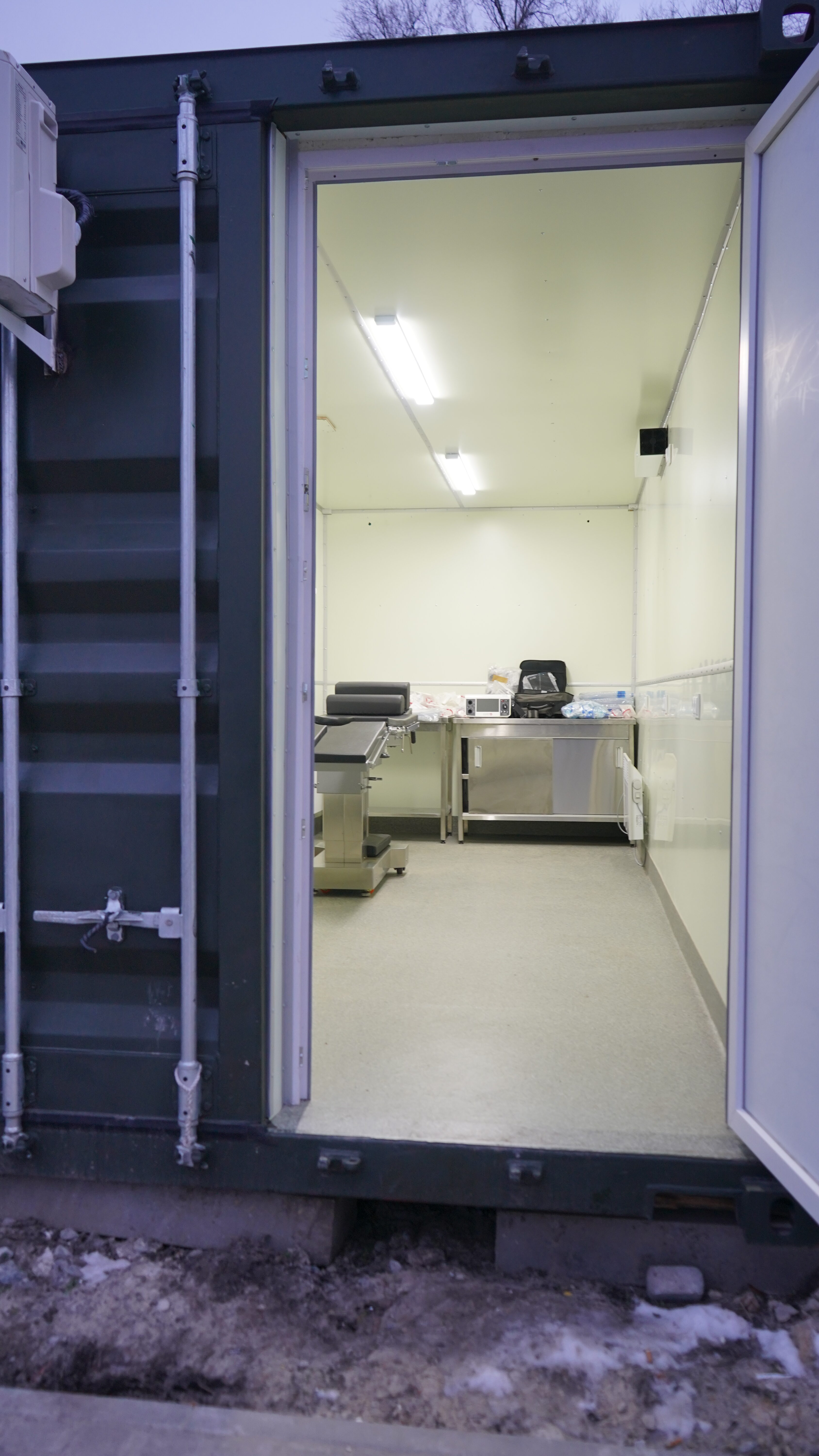 Each of the mobile field hospitals is insulated, internal work has been carried out with a coating that is easy to clean, and additional metal-plastic doors have been installed, to help maintain the temperature and conditions close to sterile in the room. Each operating room is equipped with heaters, hoods, and special lamps for sterilizing the air in the room. Each container is equipped with an enhanced socket for the generator and has nine standard sockets for quick movement and easy connection of additional equipment when necessary.